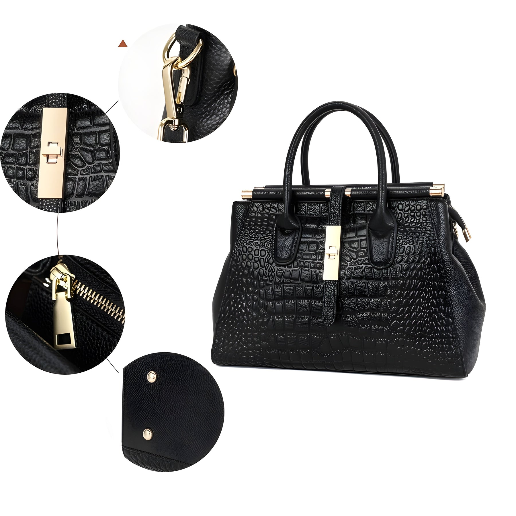 Elegance meets sophistication in this exquisitely crafted handbag, featuring a luxurious embossed alligator print on premium cowhide leather. The structured design is both modern and timeless, while the gold-plated magnetic snap closure adds a bold contrast against the sleek black finish, enhancing its chic appeal.